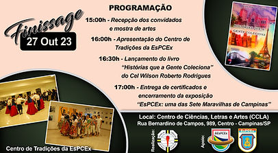 No dia 27 de outubro, durante o “finissage” da exposição, tivemos a oportunidade de apreciar uma linda apresentação do Centro de Tradições da EsPCEx. O grupo, formado por Alunos EsPCEx e sob orientação da bailarina Gabriela, apresentou danças tradicionais gaúchas, como a Quero-mana, o Tatu de Castanholas e a Chula. Em seguida, foi realizado o lançamento do livro do Coronel R1 Wilson Roberto Rodrigues “Histórias que a Gente Coleciona”, um relato muito interessante de algumas de suas experiências no decorrer de sua carreira militar. Ao final do evento, os artistas receberam suas medalhas e certificados pela participação na exposição.